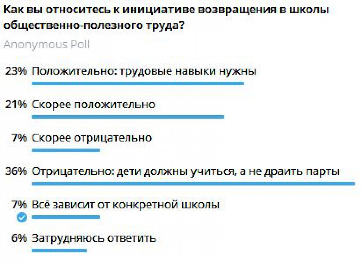 - В Госдуму внесен законопроект об обязательной общественно-полезной деятельности школьников всех возрастов (имеется в виду, в первую очередь, уборка школы и её территории) и, соответственно, об исключении из «Закона об образовании» статьи, запрещающей принуждать детей к физическому труду. Мы оперативно провели опрос среди подписчиков телеграм-канала гимназии и выяснили их отношение к введению обязательного общественно-полезного труда. Почти 45% ответивших поддерживают (либо скорее поддерживают) эту инициативу, а вот 36% отнеслись резко отрицательно: "дети должны учиться, а не драить парты". Общая картина голосования прикреплена к новости.