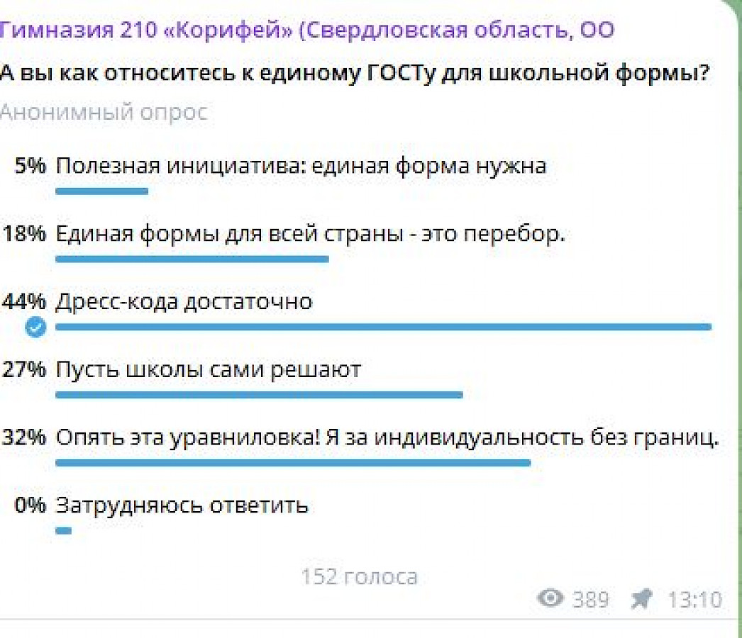 Мы провели опрос на тему единой школьной формы в телеграм-канале гимназии. Большинство опрошенных (44% из 152 человек) считают, что дресс-кода достаточно; только 5% ратуют за единую форму для всех школ страны, а 27% "топят" за индивидуальность без границ. 27% отметили пункт "Пусть школы сами решают, какую форму носить ученикам".