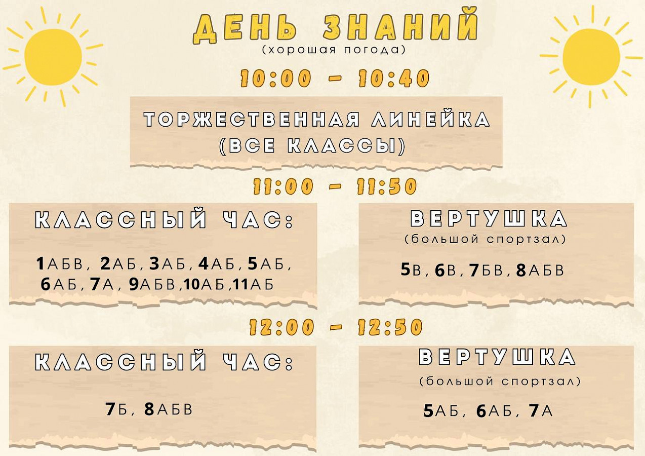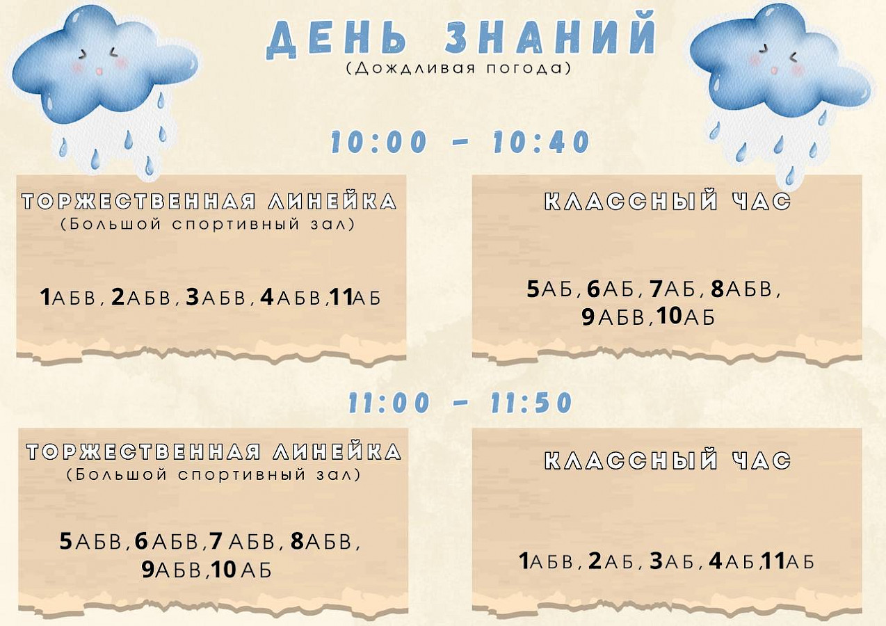 - 10:00 - 10:50 - торжественная линейка (1-АБВ, 2-АБВ, З-АБВ, 4-АБВ, 11-АБ), классные часы (5-АБ, 6-АБ, 7-АБ, 8-АБВ, 9-АБВ, 10-АБ)