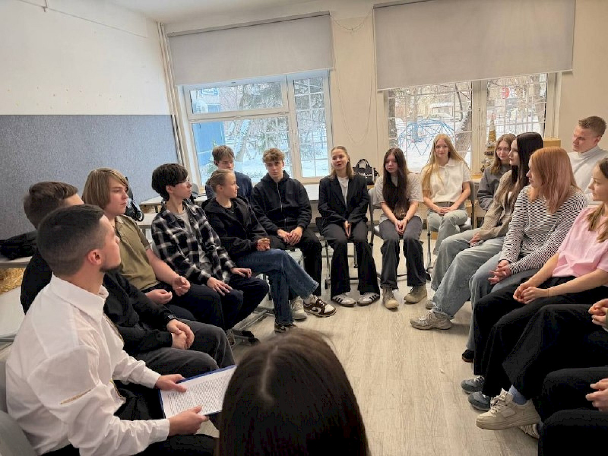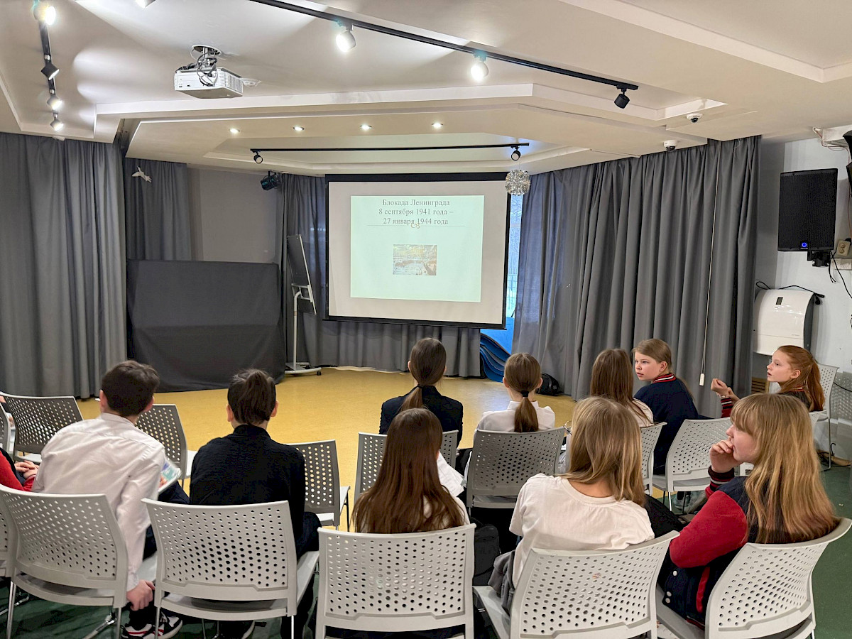 - В 7-А классе состоялся тематический классный час. Выступали Софья Тетку, Александр Герасимов, Егор Слотин и Степан Чазов: ребята напомнили одноклассникам о событиях 1941-1943 годов, подвигах жителей Ленинграда, их мужестве и силе воли. Дети обсуждали важность исторической памяти и необходимость сохранения надежды и веры даже в страшное время. Обсуждение получилось интересным, особенно семиклассникам понгравилось упражнение, когда им предлагалось называть по одному слокоторое ассоциируется у них с этим периодом истории.