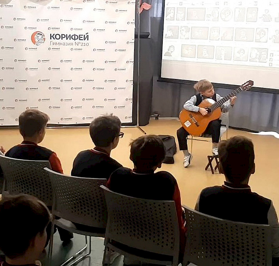 В старших классах успели обсудить и видеоклипы, заглянув в святая святых любой музыкальной группы - студию звукозаписи. А Владислав Боталов порадовал нас игрой на шестиструнной гитаре и рассказал, за что так любит этот инструмент