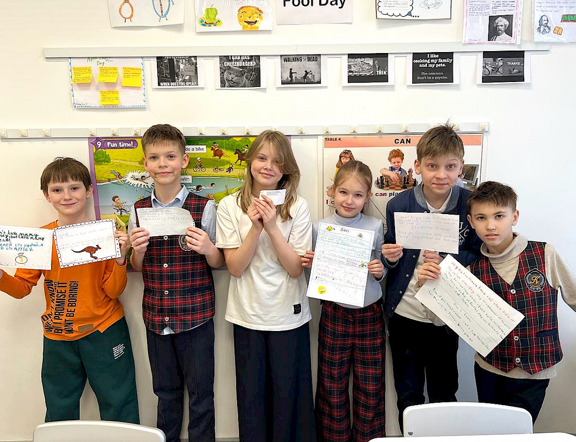 1 апреля в холле гимназии благодаря стараниям пятиклассников появились смешные яркие мемы на английском языке - дети сами находили их в разных источниках и выбирали лучшие для демонстрации.