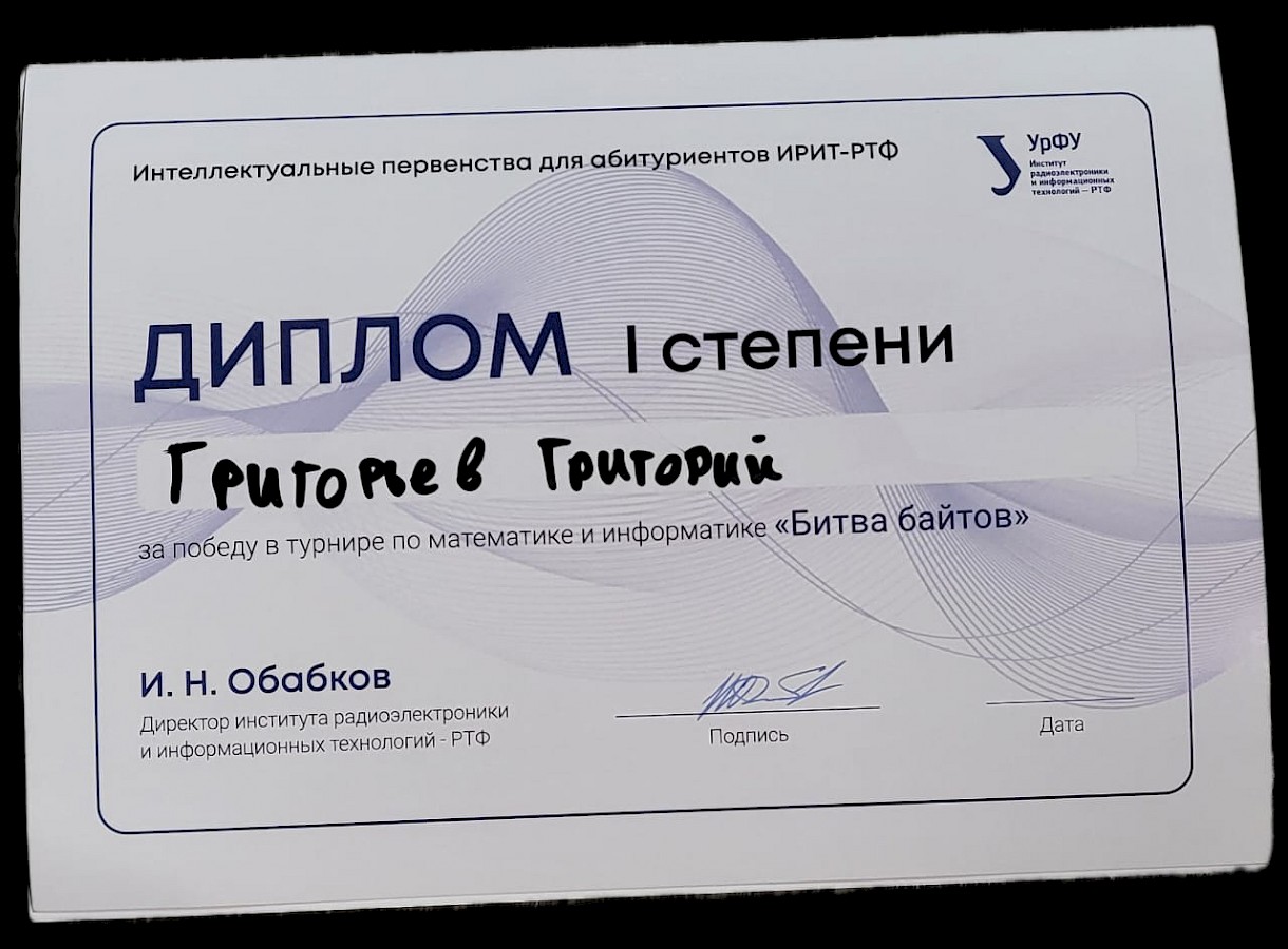 Ученик 8 А класса Григорий Григорьев посетил экскурсию в Институте радиоэлектроники и информационных технологий (ИРИТ-РТФ) УРФУ в рамках мероприятий "Дни науки". и одержал победу в турнире по математике и информатике "Битва байтов".