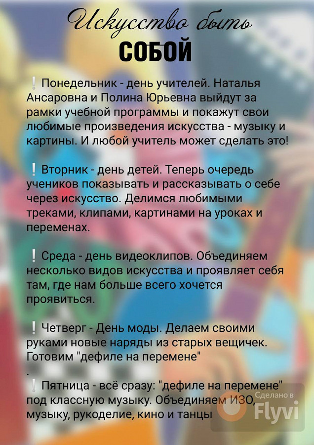 - Пятница - всё и сразу: "дефиле на перемене" под классные саундтреки. Объединяем ИЗО, музыку, рукоделие, кино и танцы.