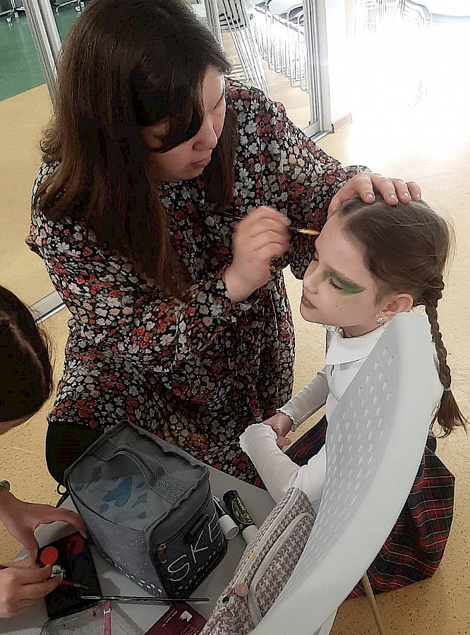 Интересно, что ученики первых классов, видя в коридорах загримированных ребят, также захотели попробовать свои силы и попросили научить их делать грим.