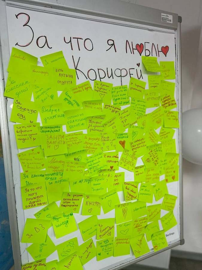 А за что наши гимназисты любят "Корифей"? На отдельном флипчарте были собраны всевозможные ответы: за крутость, за добрых учителей, праздники, вкусную еду и отдельно сосиски в тесте, за корифейский вайб, волейбол и любимых друзей... И, конечно, эти чувства взаимны: гимназия тоже любит своих учеников, заботится о них и поддерживает во всех благих начинаниях.