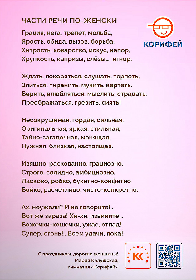 Новое стихотворение от М.В. Калужской продолжает лингвистический эксперимент с частями речи (см. поздравление мужчинам к 23 февраля), но теперь оно посвящено женщинам. Надеемся, что каждая читательница найдёт слова про себя. Ну, хотя бы пару междометий))