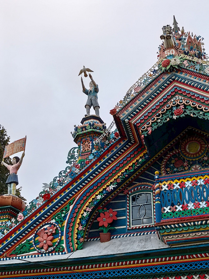 После сладкого мастер-класса осталось время прогуляться по Невьянску, покорившему нас своей особой, уральской атмосферой. Мы увидели знаменитую наклонную башню, а самым ярким впечатлением стал необыкновенный дом кузнеца Кириллова - настоящий пряничный теремок! Он весь - от крыши до фундамента - раскрашен яркими красками: здесь и цветы, и сказочные птицы, и добрые звери, и герои народных сказок. Пёстрая красота, словно сошедшая со страниц детской книжки, создает ощущение настоящего чуда.