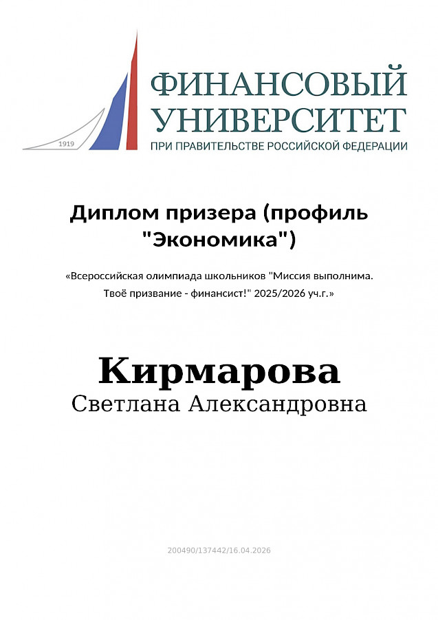 Светлана Кирмарова, ученица 11 класса стала призёром вузовской олимпиады по экономике, организованной Финансовым университетом при Правительстве РФ.