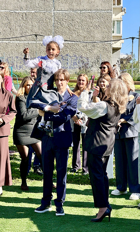 Ещё недавно хмурое небо то и дело поливало город дождём, но в День Знаний решило очиститься и выпустить из-за облаков солнце. Поэтому линейка прошла на футбольном поле - для всех классов сразу.
