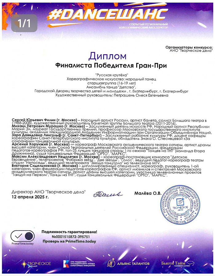 И на этот раз лауреат и обладатель Гран-при международных фестивалей и конкурсов Ансамбль танца "Детство" городского Дворца творчества детей и молодёжи в очередной раз награждён Дипломом финалиста Победителя Гран- При за танец "Русская крутеха".