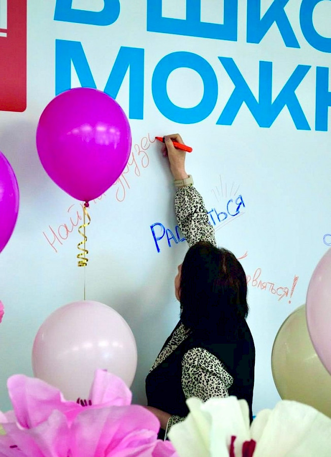 Для начала мы решили спросить у делегатов форума «Что можно в школе?». На чистом полотне нашей фотозоны появились сначала скромные, а затем все более размашистые и радостные ответы: радоваться, дружить, любить, проявляться!