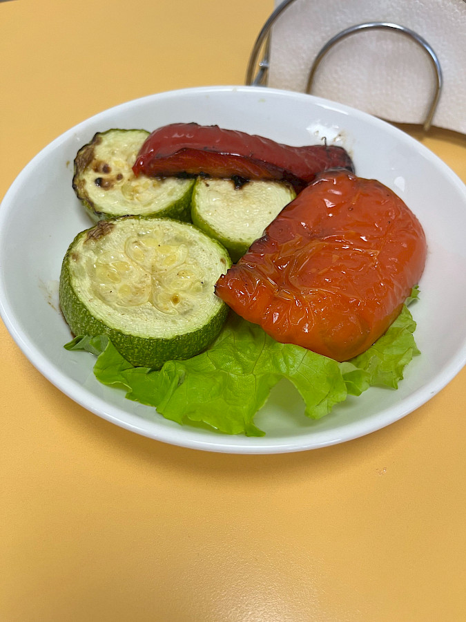 Новое блюдо в школьном меню - запеченые особым образом овощи. Овощи запекаются в пароконвектомате, что сохраняет все полезные свойства, вещества и витамины. А кроме того, овощи из пароконвектомата необычайно вкусные. На этот раз повара приготовили молодые кабачки-цукини с болгарским сладким перцем.